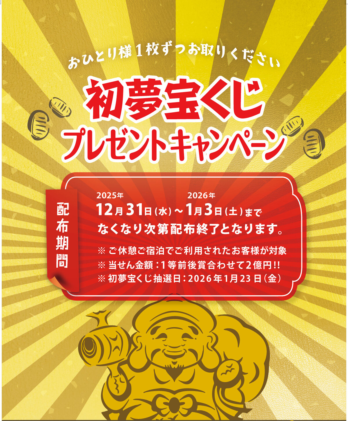 初夢宝くじプレゼント!(12/31~1/3) 2025.12.27イベント 12/31~1/3限定!休憩・宿泊ご利用の方に 「初夢宝くじ」をプレゼント! 当選金額は、1等前後賞合わせて2億円!! 新年最初の運試しをゴマックスでどうぞ。